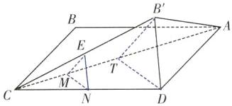 7.A 二面角的定义+立体几何中的轨迹问题+线面平行、面面平行的判定+线面垂直的判定与性质 数形结合法 如图,取AC的中点T,连接B'T,DT,因为菱形ABCD的边长为4,∠ABC = 120°,所以B'C = AB' = CD = AD = 4,故DT⊥AC,B'T⊥AC,且DT = B'T = $\frac{1}{2}$AD = 2,所以∠B'TD为二面角B' - AC - D的平面角(题眼),则∠B'TD = 30°。在△B'TD中,由余弦定理得,|B'D| = $\sqrt{DT^{2}+B'T^{2}-2DT\cdot B'T\cos30°}$ = $\sqrt{2^{2}+2^{2}-2\times2\times2\times\frac{\sqrt{3}}{2}}$ = $\sqrt{8 - 4\sqrt{3}}$ = $\sqrt{6}-\sqrt{2}$。取CT的中点M,CD的中点N,连接EM,EN,MN,又E为B'C的中点,所以EM//B'T,MN//DT,因为EM⊂平面EMN,B'T⊄平面EMN,所以B'T//平面EMN,同理得DT//平面EMN,又B'T∩DT = T,B'T,DT⊂平面B'TD,故平面EMN//平面B'TD。因为DT⊥AC,B'T⊥AC,B'T∩DT = T,B'T,DT⊂平面B'TD,所以AC⊥平面B'TD,所以AC⊥平面EMN,故点F的轨迹为△EMN(除点E外),故点F的轨迹的长度为EM + MN + EN = $\frac{1}{2}$(B'T + DT + B'D) = $\frac{4+\sqrt{6}-\sqrt{2}}{2}$。故选A。