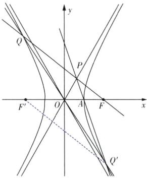 6.B 双曲线的离心率 数形结合法 如图,记直线AP与直线OQ的交点为Q',由题意及双曲线的对称性知,点Q与点Q'关于坐标原点对称(题眼)。记双曲线E的左焦点为F',连接F'Q,易得F'Q'//FQ,|F'Q'| = |FQ|,所以△F'Q'A∽△FPA,又$\overrightarrow{PQ}$ = -2$\overrightarrow{PF}$,所以|FP| = $\frac{1}{3}$|FQ| = $\frac{1}{3}$|F'Q'|。记双曲线E的半焦距为c,则$\frac{|F'A|}{|FA|}$ = $\frac{c + a}{c - a}$ = 3,得$\frac{c}{a}$ = 2,所以双曲线E的离心率e = $\frac{c}{a}$ = 2。故选B。