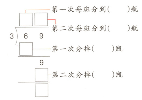 1. [新趋势·算理探究]69瓶水平均分给三年级的3个班,每班分到多少瓶?用小棒代替水分一分,算一算。