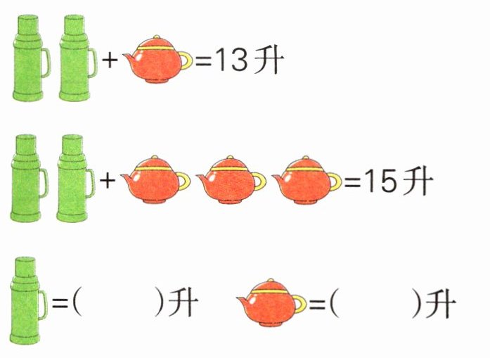 解析:2个暖壶加1个茶壶是13升,2个暖壶加3个茶壶是15升,多了2个茶壶,多了15-13=2(升),也就是说2个茶壶共2升,所以一个茶壶的容量是1升,一个暖壶的容量是(13-1)÷2=6(升)或(15-3)÷2=6(升)。