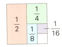 $\frac{1}{16}$ $\frac{15}{16}$解析:观察这道算式,每个分数的分子都是1,后一个分数的分母是前一个分数分母的2倍,数形结合可知,求$\frac{1}{2}+\frac{1}{4}+\frac{1}{8}+\frac{1}{16}$的和,可以用“1”减去$\frac{1}{16}$,也就是$\frac{15}{16}$。