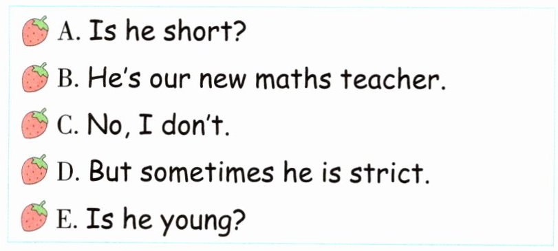1. No, I don't. 2. He's our new maths teacher. 3. Is he young? 4. Is he short? 5. But sometimes he is strict.