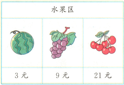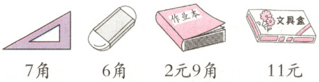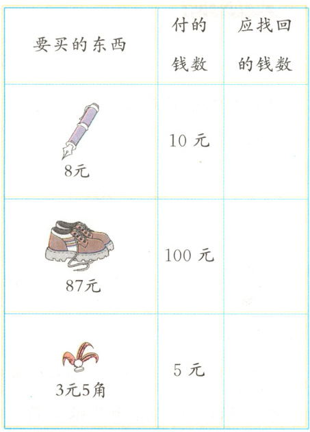 2、2元 13元 1元5角 方法点拨:钢笔8元,付10元,应找回10−8=2元;鞋子87元,付100元,应找回100−87=13元;毽子3元5角,付5元,应找回5元−3元5角=1元5角。