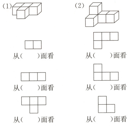 1. 填空。(找出从正面、上面、左面看到的形状)