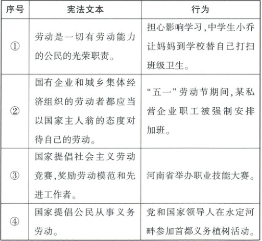 5.D【解析】本题考查劳动、宪法的相关知识。明确题目主旨及设问指向,结合所学知识分析可知,①中学生小乔让妈妈到学校替自己打扫班级卫生,是缺乏劳动意识的表现,应排除。②某私营企业是非公有制经济,被强制安排加班,违反了劳动法的规定,侵犯了职工的休假权,应排除。③河南省举办职业技能大赛属于劳动竞赛,体现“奖励劳动模范”,符合宪法文本内容。④党和国家领导人参加首都义务植树活动符合宪法文本内容“国家提倡公民从事义务劳动”。③④表述正确且符合题意。故本题选D。