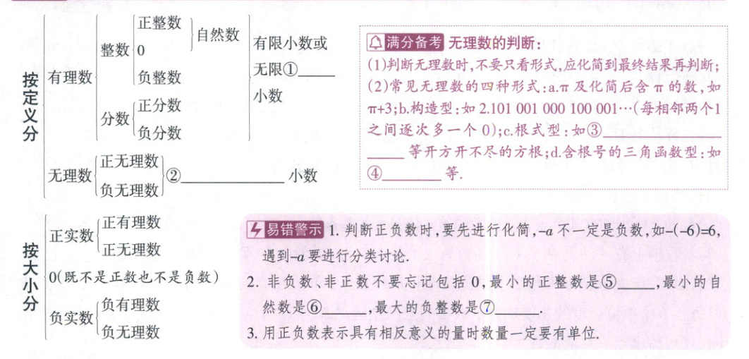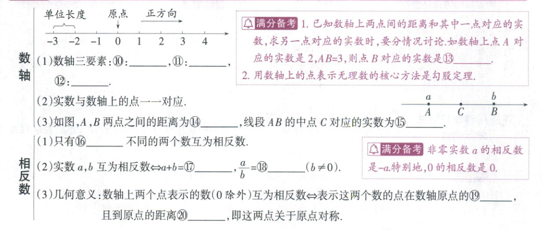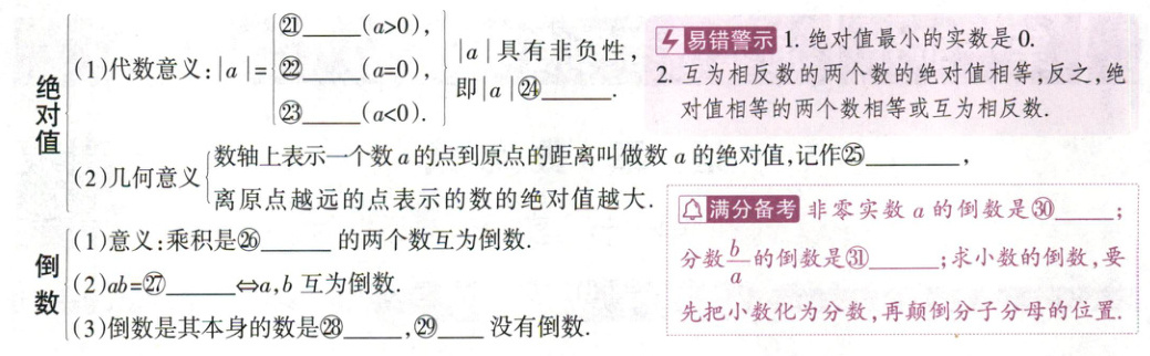 ⑩原点 ⑪正方向 ⑫单位长度 ⑬5或-1 ⑭$|a - b|$(或$b - a$) ⑮$\frac{a + b}{2}$ ⑯符号 ⑰0 ⑱-1 ⑲两侧 ⑳相等 ㉑$a$㉒0 ㉓$-a$ ㉔$\geq0$ ㉕$|a|$ ㉖1 ㉗1 ㉘$\pm1$ ㉙0 ㉚$\frac{1}{a}$ ㉛$\frac{a}{b}$