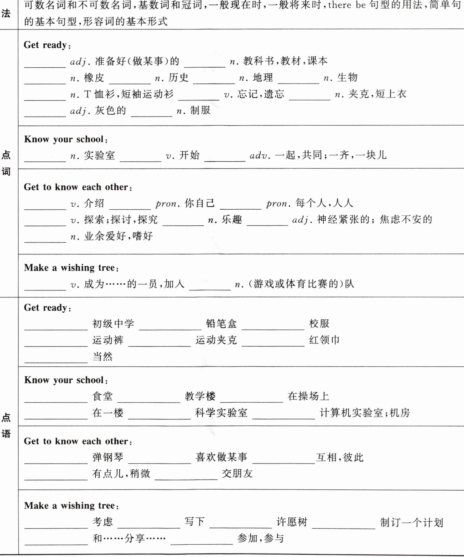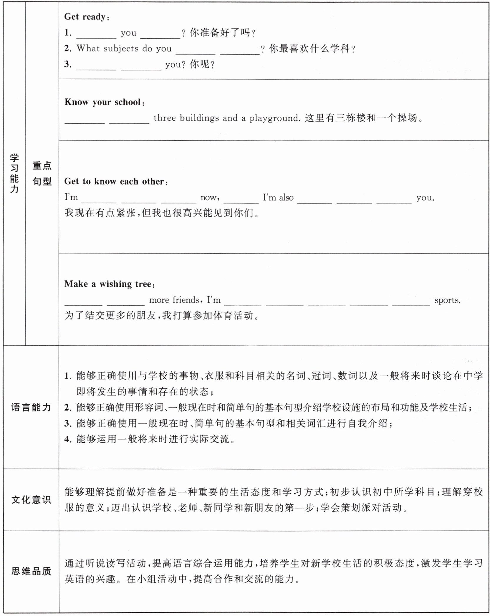 sports.2. 能够正确使用形容词、一般现在时和简单句的基本句型介绍学校设施的布局和功能及学校生活;