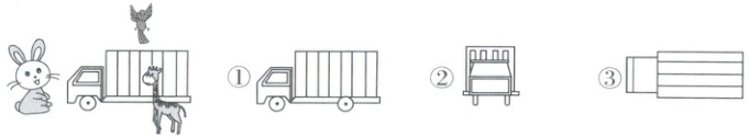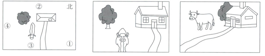 5. 下面左图是在空中看到的李爷爷家,房子周围有一棵大树和一头牛,门前有一条小路。右边的两幅图是什么位置看到的?(填序号)