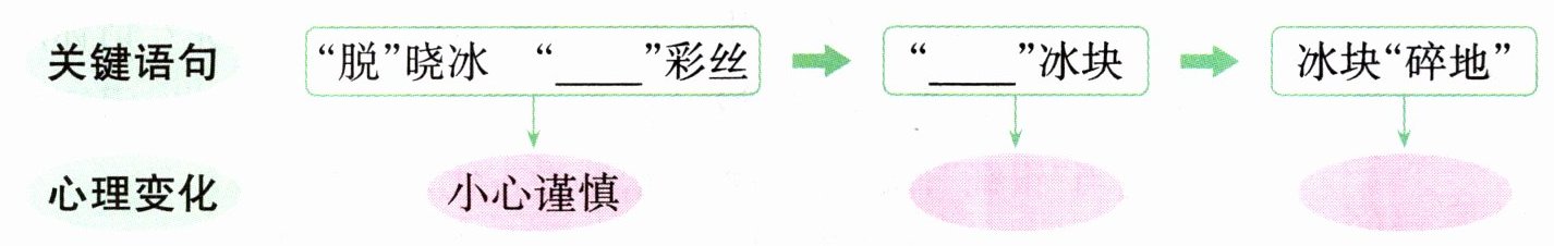 2.穿 敲 得意 懊恼 解析:本题考查对古诗的理解。《稚子弄冰》描写了孩子在严寒天气弄冰玩耍、自得其乐的场景,将孩子取冰和穿丝时的小心谨慎、敲冰时的得意、冰碎时的懊恼一一呈现,表达了诗人对孩子的喜爱之情。
