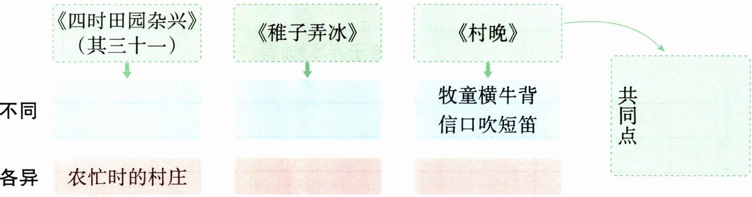 答案: 童孙学种瓜 稚子弄冰、嬉戏 寒冬时的村庄 夕阳西下的池塘边 都写了儿童的生活,表现了儿童的纯真、可爱。
