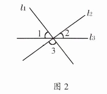 2. 如图 2,三条直线$l_{1}$、$l_{2}$、$l_{3}$相交于一点,$∠1 = 60^{\circ}$,$∠2 = 30^{\circ}$,则$∠3 = $ 。