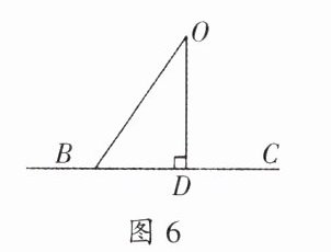 6. 如图 6,$OD⊥BC$,垂足为$D$,$BD = 6cm$,$OD = 8cm$,$OB = 10cm$,那么点$B到OD$的距离是 ,点$O到BC$的距离是 ,$O$、$B$两点之间的距离是 。