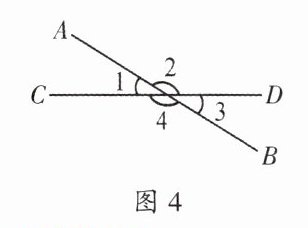 4. 如图 4 所示,$AB与CD$相交所成的四个角中,$∠1$的邻补角是 ,$∠1$的对顶角是 。