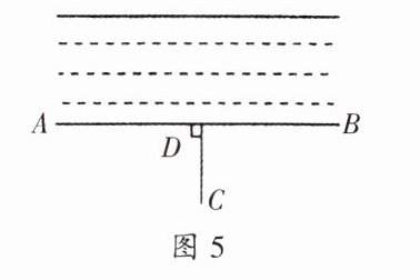 5. 如图 5,计划把池中的水引到$C$处,可过点$C作CD⊥AB于D$,然后沿$CD$开渠,可使所开的渠道最短。这种设计的依据是 。