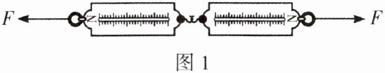 5. 如图 1 所示,两个弹簧测力计钩在一起,两边分别施加拉力 F,使测力计静止。则弹簧测力计的读数大小为()