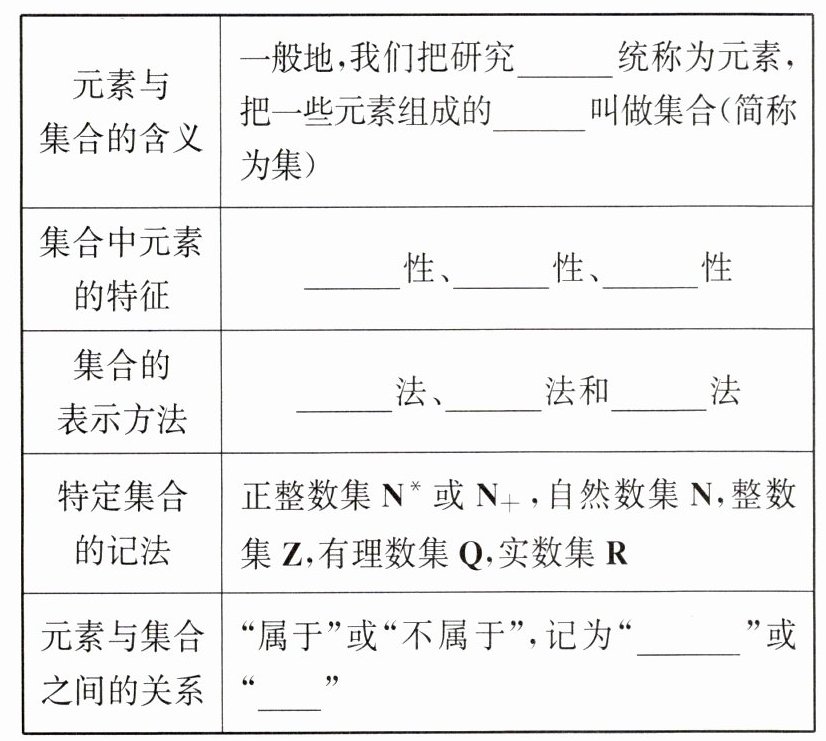 答案:  对象 总体 确定 互异 无序 列举 描述 图示 ∈ ∉