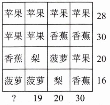 有一次,一位美国心理学家出了这样一道题来测试爱因斯坦的智力:把一个正方形分成16个小方格,每个小方格分别是苹果、梨、菠萝和香蕉四种水果中的一种(如图所示),小方格的右边和下边分别是4行小方格和4列小方格水果的总质量,要求算出左边第一列水果的质量. 爱因斯坦很快得出了结果,你能解答吗?