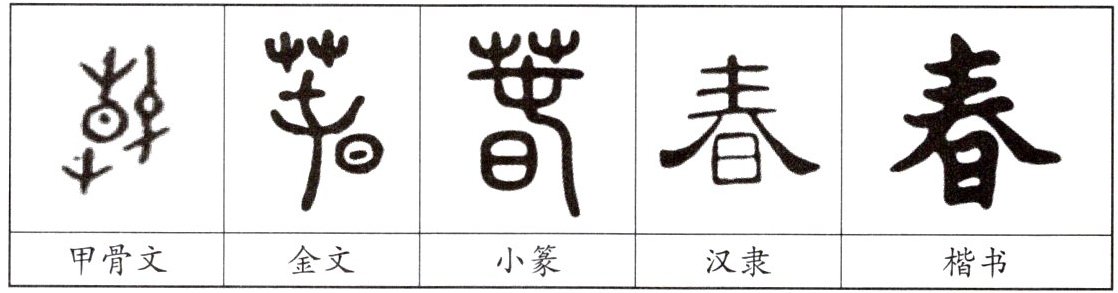 1【春字探源】下图为"春"字的演变过程。"春"字的早期写法一般是由"屮(草)、日、屯"等构成,其中"屯"像草木刚生长出来的样子。由此,我们可以猜想古人创造"春"字的想法是:______。(2分)