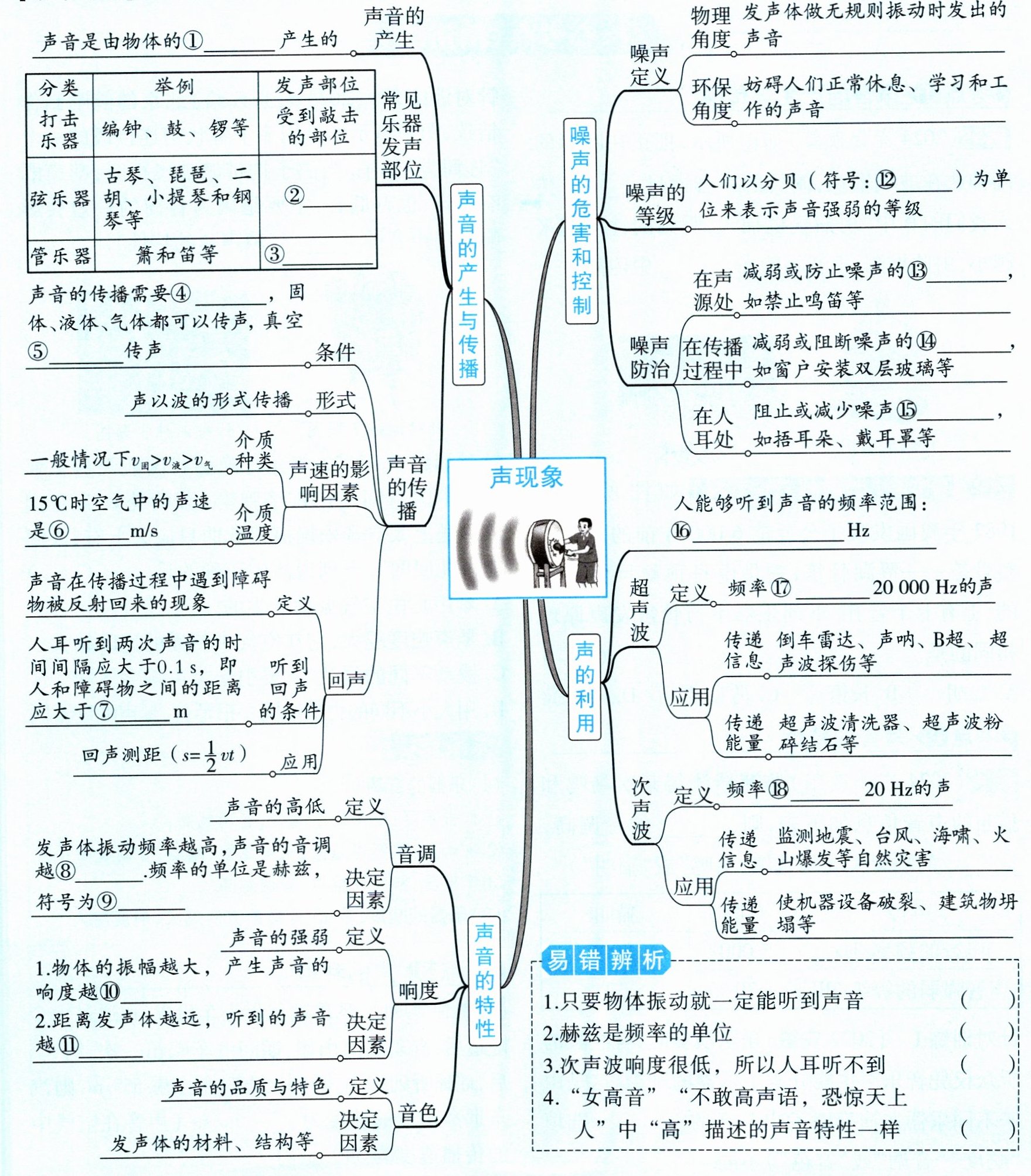 ①振动 ②弦 ③空气柱 ④介质 ⑤不能 ⑥340 ⑦17 ⑧高 ⑨Hz ⑩大 ⑪小 ⑫dB ⑬产生 ⑭传播 ⑮入耳 ⑯20 ~ 20 000 ⑰高于 ⑱低于 [易错辨析] 1. × 2. √ 3. × 4. ×
