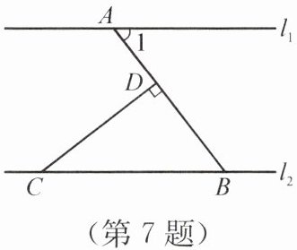 7. 如图所示,直线 $ l_1 // l_2 $,$ CD \perp AB $,垂足为 $ D $,$ \angle 1 = 50^\circ $,则 $ \angle BCD $ 的度数为(