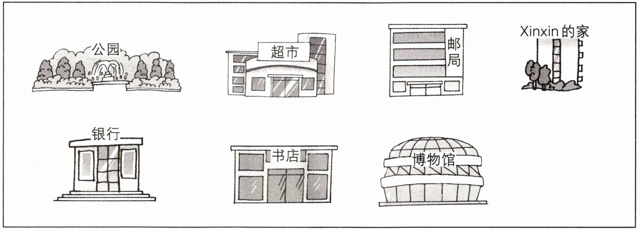 一、Listen and tick. Xinxin刚搬了新家,她和爸爸打算明天四处转转,他们要去哪些地方?请听一听,在相应的图片下面画“√”。