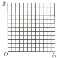 (1)因为点A在点O北偏东45°方向上,所以在坐标纸上点A距点O的横向小方格数与纵向小方格数相等.又$|\overrightarrow{OA}| = 4\sqrt{2}$,小方格的边长为1,所以点A距点O的横向小方格数与纵向小方格数都为4,于是点A的位置可以确定,画出向量$\overrightarrow{OA}$,如图所示.
