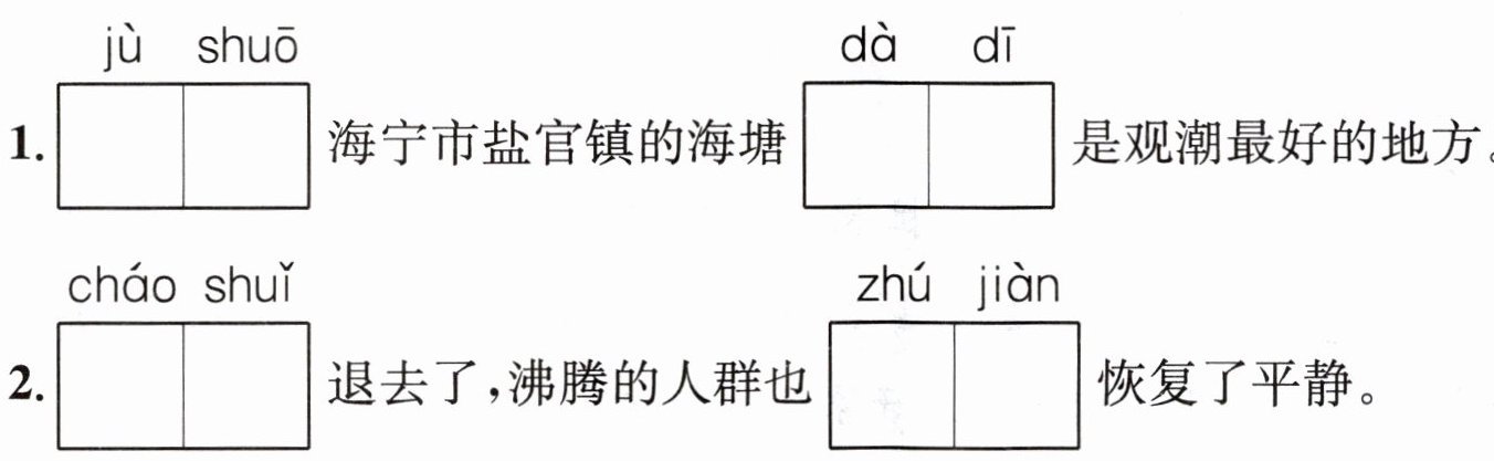 1.示例:宽阔 2.示例:千军万马一齐冲锋,使人胆战心惊 3.钱塘江大潮是天下奇观。