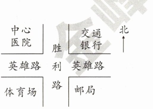 4. 交通银行在体育场的( )方,中心医院在邮局的( )方。
