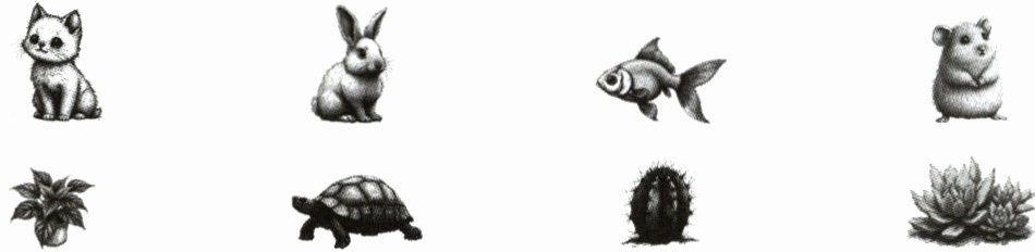 一、下面是齐齐家养的动物和种植的植物,请你把每行中不同类的圈出来。(共4分)