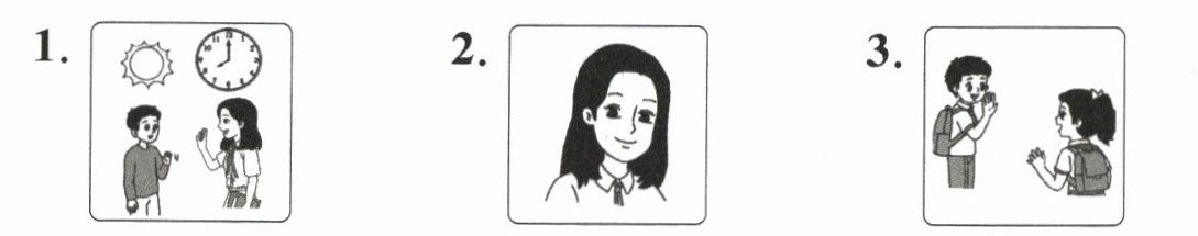 3. 第三幅图是两个背着书包的孩子在打招呼,可能对应关于上学或打招呼的表述,依据录音判断。