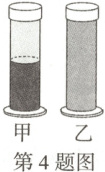 4. (教材图改编)实验课上,小明准备了水和硫酸铜溶液($\rho_{水}<\rho_{溶液}$),在玻璃筒里装一半清水,用细管在水的下面注入硫酸铜溶液后如图甲所示. 静放几天后观察到容器内的现象如图乙所示,说明液体分子在不停地