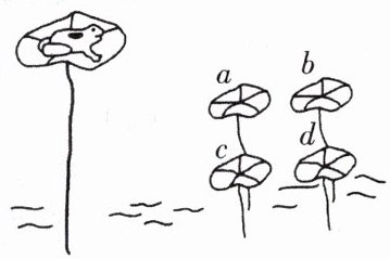 C [青蛙做平抛运动,在竖直方向做自由落体运动,$ h = \frac{1}{2} g t^2 $,水平方向做匀速直线运动,$ x = v_0 t $,水平初速度 $ v_0 = x \sqrt{\frac{g}{2h}} $,要使水平初速度最小,则需要水平位移x最小、竖直位移h最大;由于a、c荷叶与青蛙的水平位移最小,c、d荷叶与青蛙的高度差最大,跳到荷叶c上同时满足水平位移最小,竖直位移最大,故ABD错误,C正确。]