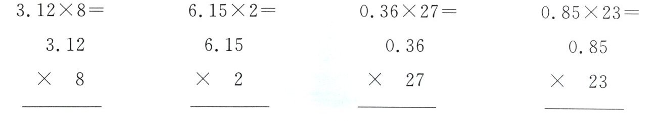计算小数×整数,先按照整数乘法算出积,再点小数点。比如$0.36×27$,先算(