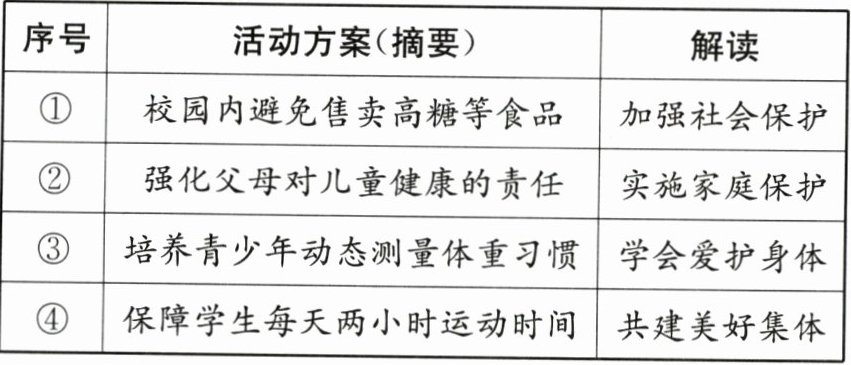 6.C 解析本题考查对未成年人的特殊保护、守护生命的相关知识。校园内避免售卖高糖食品属于学校保护,而非社会保护,①错误;强化父母责任直接对应家庭保护(监护人的职责),②正确;守护生命首先要关注自己的身体,培养测量体重习惯是青少年爱护身体的具体表现,③正确;保障学生运动时间有利于促进学生身心健康发展,体现学校保护,④错误。