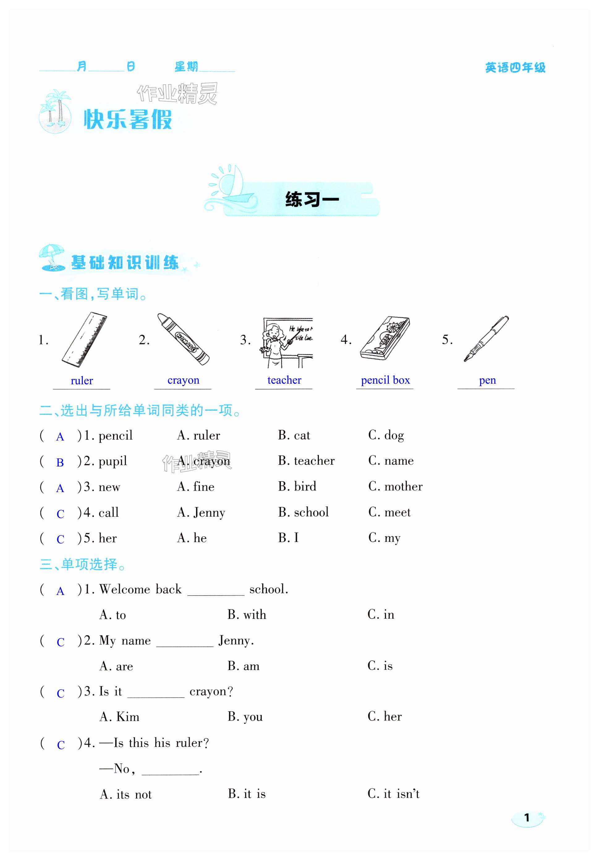 注:目前有些书本章节名称可能整理的还不是很完善,但都是按照顺序排列的,请同学们按照顺序仔细查找。练习册 2025年乐享暑假生活四年级英语冀教版 答案主要是用来给同学们做完题方便对答案用的,请勿直接抄袭。