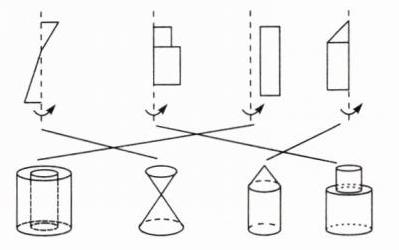 5. 如图,在一个圆柱体内部挖一个等高的圆锥体,再沿着竖直方向和水平方向分别切一刀,下面哪个图形可能是竖直方向切出的截面? 哪个图形可能是水平方向切出的截面?
