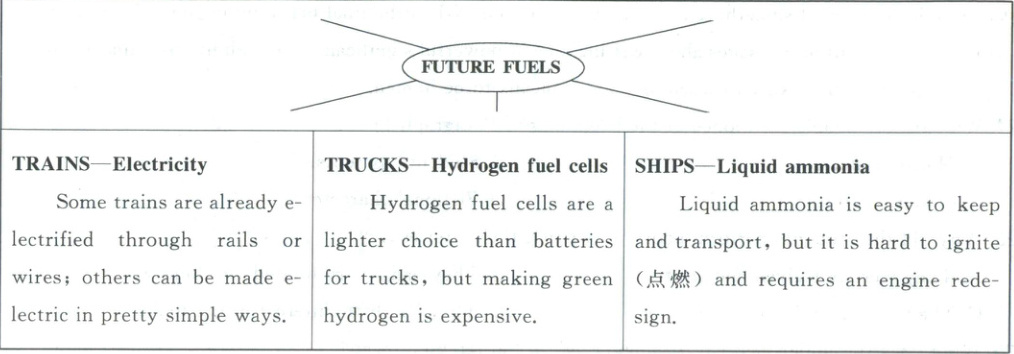 22.C 细节理解题。根据图表信息TRAINS—Electricity部分中“Some trains are already electrified through rails or wires; others can be made electric in pretty simple ways.(一些列车已经通过轨道或电线实现了电气化;其他火车可以通过非常简单的方式实现电动化。)”可知,火车相较其他交通方式更易实现绿色化。故选C项。