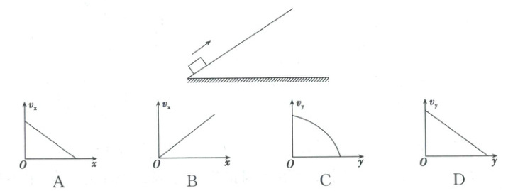2. 如图,物块以某一初速度滑上足够长的固定光滑斜面,物块的水平位移、竖直位移、水平速度、竖直速度分别用$x$、$y$、$v_x$、$v_y$表示。物块向上运动过程中,下列图像可能正确的是( )