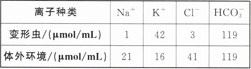 4. 将单细胞动物变形虫置于人工设置的液体环境中,定期测定变形虫和环境中的离子浓度,下表为离子浓度稳定后的数据。