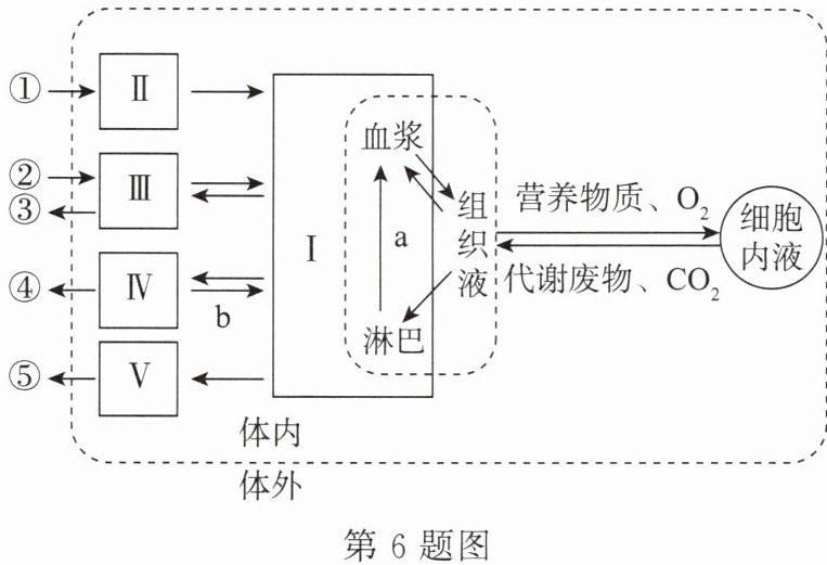 6.C 【解析】据题图分析,题图表示人体细胞与外界环境之间进行物质交换的过程,Ⅰ、Ⅱ、Ⅲ、Ⅳ、Ⅴ表示直接参与的几种系统或器官,依次是循环系统、消化系统、呼吸系统、泌尿系统(肾脏)和皮肤。①、②、③、④、⑤表示相关物质,依次是食物、$O_2$、$CO_2$、尿液、汗液。a表示淋巴转化为血浆,b表示肾小管和集合管对原尿的重吸收。食物中的大分子物质在消化系统中被分解成小分子物质并被吸收到内环境中,即食物的消化和吸收发生在Ⅱ中,A错误;Ⅲ是呼吸系统,呼吸系统的功能是从外界吸收 $O_2$、排出 $CO_2$,$CO_2$、$O_2$ 需通过肺泡壁细胞和毛细血管才能进入血浆,实现气体交换,仅通过呼吸系统无法完成空气与内环境间的交换,B错误;Ⅳ是泌尿系统,细胞的代谢废物、水和无机盐主要通过泌尿系统排出体外,C正确;Ⅴ为皮肤,是人体最大的器官,皮肤的分泌物是汗液,汗液分泌过多,会导致细胞外液的渗透压升高,D错误。