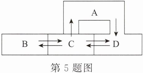 5.D 【解析】体液可以分为细胞内液和细胞外液,细胞外液又称为内环境,其包括组织液、血浆、淋巴。分析题图可知,A、B、C、D依次为淋巴、细胞内液、组织液、血浆,①错误;抗体可以存在于C组织液中,②正确;A是淋巴,淋巴中有吞噬细胞和淋巴细胞等,③正确;DNA解旋酶是胞内酶,存在于B细胞内液中,④正确,D符合题意。