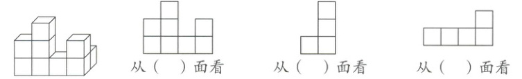 $2. $下面的三个图形分别是从什么方向看左下方几何体得到的$?$填一填。
