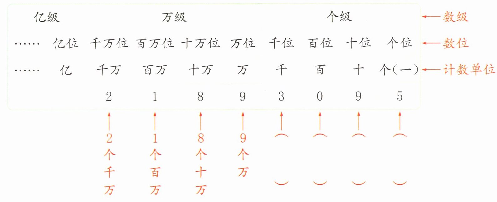 例题:在日常生活和生产中,我们经常用到比万大的数。你知道右图这个数中每个数字的含义吗?
