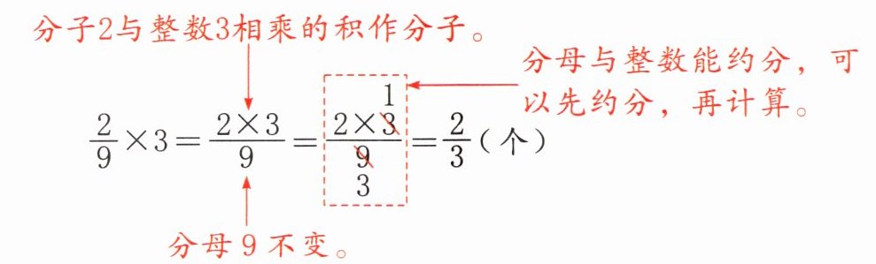 $\frac{2}{9}+\frac{2}{9}+\frac{2}{9}$$\xrightarrow{3个加数相同}\frac{2}{9}× 3或3× \frac{2}{9}$$\xrightarrow{表示3个\frac{2}{9}相加或\frac{2}{9}的3倍。}$