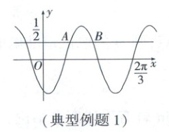 典型例题1. $-\frac{\sqrt{3}}{2}$ 解析:设$A\left(x_1,\frac{1}{2}\right),B\left(x_2,\frac{1}{2}\right)$,由$\vert AB\vert=\frac{\pi}{6}$可得$x_2 - x_1=\frac{\pi}{6}$,由$\sin x=\frac{1}{2}$可知,$x=\frac{\pi}{6}+2k\pi$或$x=\frac{5\pi}{6}+2k\pi,k\in Z$,由题图可知,$\omega x_2+\varphi-(\omega x_1+\varphi)=\frac{5}{6}\pi-\frac{\pi}{6}=\frac{2\pi}{3}$,即$\omega(x_2 - x_1)=\frac{2\pi}{3}$,所以$\omega=4$.因为$f\left(\frac{2}{3}\pi\right)=\sin\left(\frac{8\pi}{3}+\varphi\right)=0$,所以$\frac{8\pi}{3}+\varphi=k\pi$,即$\varphi=-\frac{8}{3}\pi+k\pi$,$k\in Z$.所以$f(x)=\sin\left(4x-\frac{8}{3}\pi+k\pi\right)=\sin\left(4x-\frac{2}{3}\pi+k\pi\right)$,所以$f(x)=\sin\left(4x-\frac{2}{3}\pi\right)$或$f(x)=-\sin\left(4x-\frac{2}{3}\pi\right)$.又因为$f(0)<0$,所以$f(x)=\sin\left(4x-\frac{2}{3}\pi\right)$,所以$f(\pi)=\sin\left(4\pi-\frac{2}{3}\pi\right)=-\frac{\sqrt{3}}{2}$