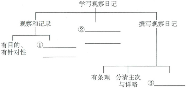 2. 小明同学想把学写观察日记的方法转换为思维导图, 以方便记笔记, 请依据下文内容补全思维导图。(4 分)