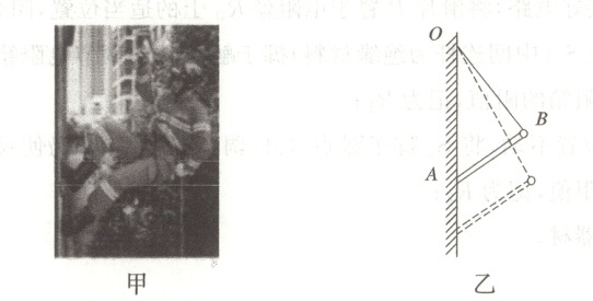 2.消防员在救援过程中需要从顶楼直降到某一楼层,如图甲所示。在下降过程中,可以将模型简化为如图乙所示的物理模型。脚与墙壁接触点为$A$点,人的重力全部集中在$B$点,$A$到$B$可简化为轻杆,$OB$为轻绳。已知下降过程中$AB$的长度和$AB$与竖直方向的夹角保持不变。初始时刻消防员保持静止,下降一定高度后再次保持静止。再次静止后相对于初始位置,下列判断正确的是