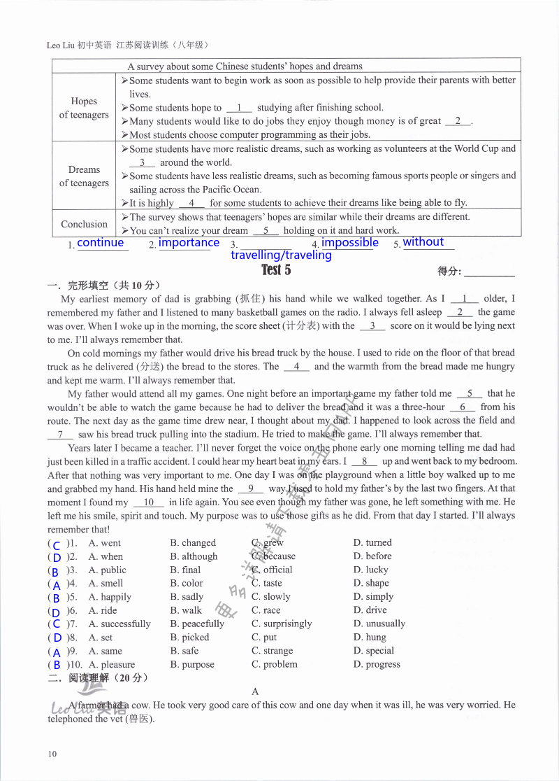 注:目前有些书本章节名称可能整理的还不是很完善,但都是按照顺序排列的,请同学们按照顺序仔细查找。练习册 2021年LeoLiu初中英语八年级听力训练阅读训练 答案主要是用来给同学们做完题方便对答案用的,请勿直接抄袭。