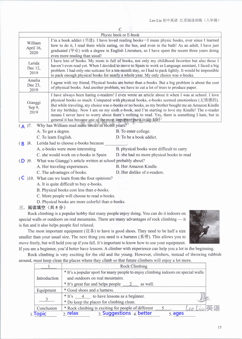 注:目前有些书本章节名称可能整理的还不是很完善,但都是按照顺序排列的,请同学们按照顺序仔细查找。练习册 2021年LeoLiu初中英语八年级听力训练阅读训练 答案主要是用来给同学们做完题方便对答案用的,请勿直接抄袭。