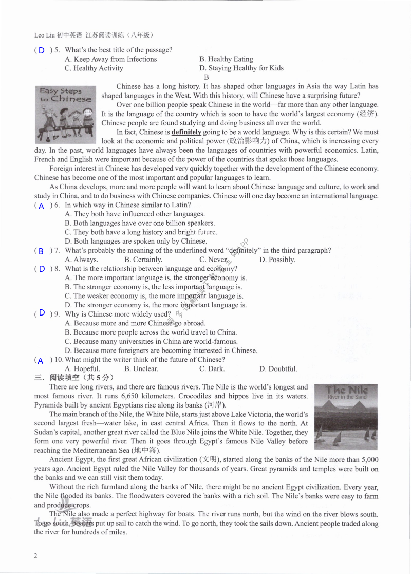 注:目前有些书本章节名称可能整理的还不是很完善,但都是按照顺序排列的,请同学们按照顺序仔细查找。练习册 2021年LeoLiu初中英语八年级听力训练阅读训练 答案主要是用来给同学们做完题方便对答案用的,请勿直接抄袭。